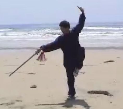 2. Ding bu dian jian: Pictured above. Master Tsao describes the pointing of the sword as a pecking movement, like a bird pecking with its beak. The traditional name for this is Dragonfly Dipping Water.
