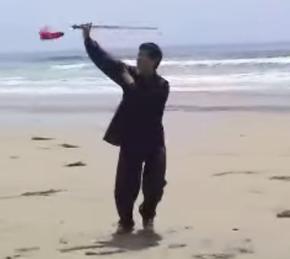 The hard part of this section is the transitional flourish between the covering posture and the skip-and-stab that follows. (1) From the cover position shown above, swing all the way around, sword following body in a big circle, both feet pivoting. (2) Step back with the right foot while making a small wrist-circle with the sword. (3) Pivot on the right heel to face the back while pulling the sword all the way around to a high position as shown below.