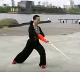 From the position shown above: Stab once, then bing bu xia ci, wheel the sword the other way (counterclockwise) while stepping across in back with the left foot. Swing the sword first back, then out to this position: