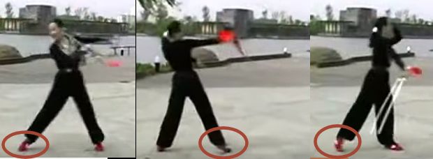 The right foot (circled) does not move, except to swivel, as she steps around left, left, left.