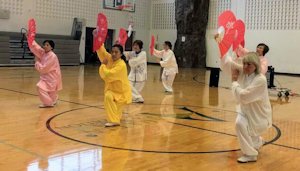 My weekend practice group has performed with as many as seven people, in settings as diverse as Chinese New Year parties, community centers, and nursing homes. Above, Long Feng, Hu Peiyi and I (L-R front row) perform Kung Fu Fan for a senior lunch at the Gus Garcia Community Center in Austin in 2018.
