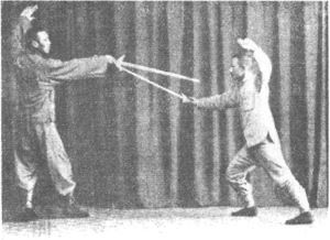 Having achieved in solo practice familiarity with the thirteen jianfa, a student would then move up to sparring with a partner. The simplest two-person sets involve studying how the sword techniques fit together to make triangles.
